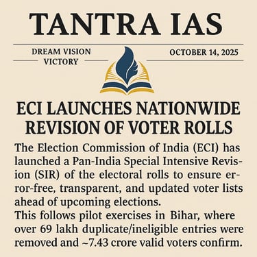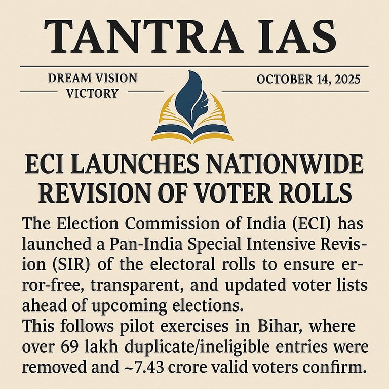 The Election Commission of India (ECI) has launched a Pan-India Special Intensive Revision (SIR) of the electoral rolls to ensure error-free, transparent, and updated voter lists ahead of upcoming elections.