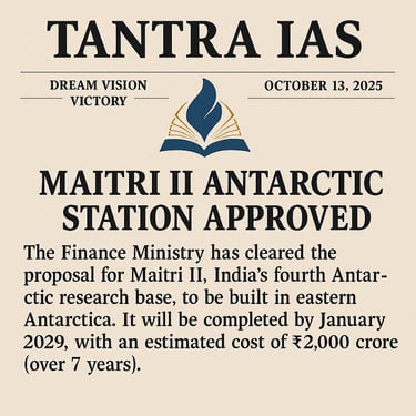 The Finance Ministry has approved the establishment of Maitri II, India’s fourth Antarctic research base, to be built in eastern Antarctica by January 2029.